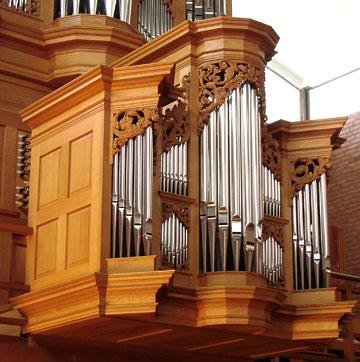 The intermanual coupler functions in the Dutch manner: the Werk couples to the Rückpositiv. This is particulary useful in leading hymn singing. The accompaniment can be played on the Werk, and its stops combined with those of the Rückpositiv play the choral tune.
