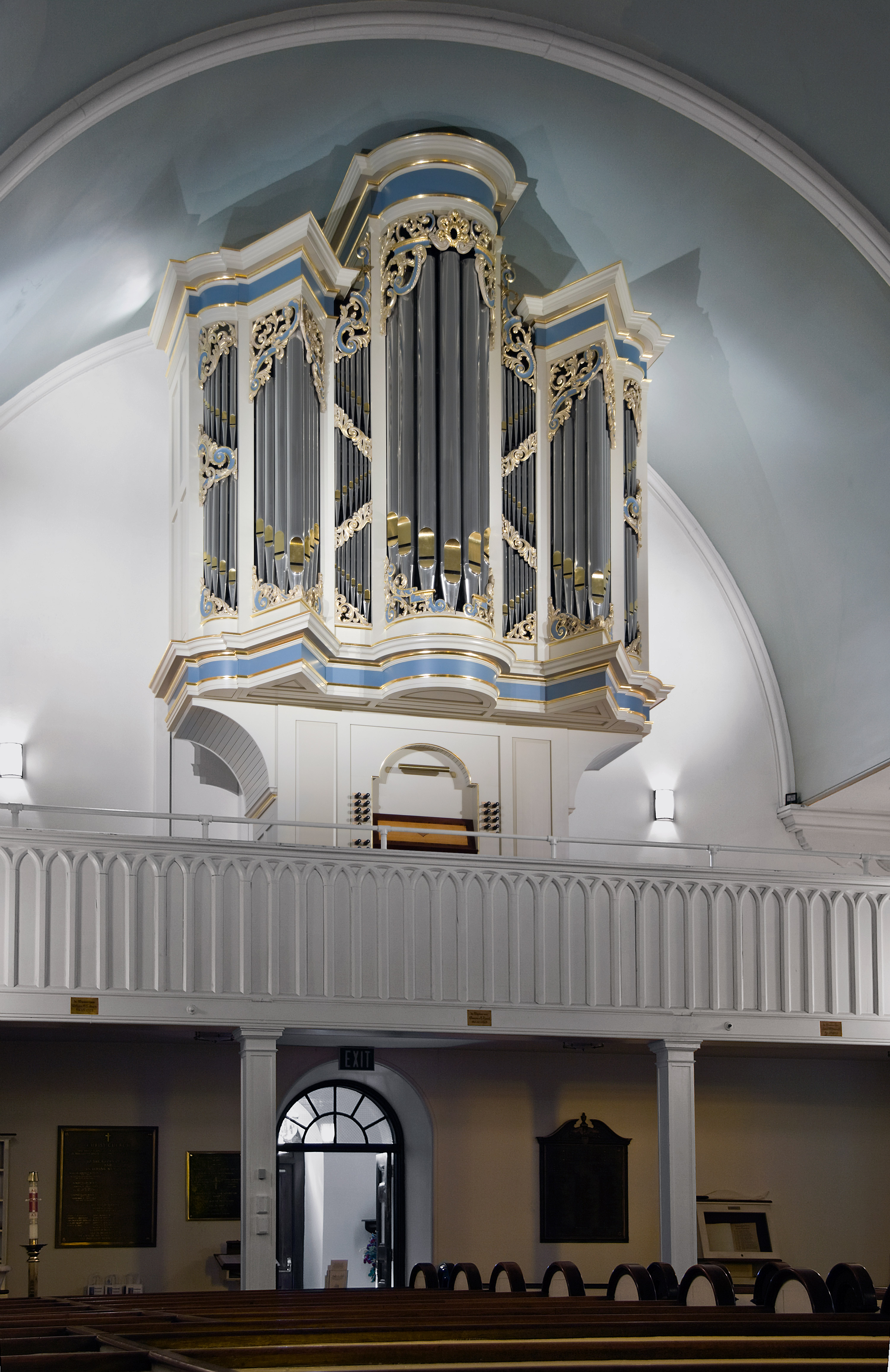 This organ packs a complete 2 manual organ with swell box into a small (16 foot a sharp) Dutch style polychromed and water-gilt case. The 8 foot Principal tc of the swell is incorporated into the entirely speaking façade, and presents a wonderful foil to the great Principal 8. Voiced with a late Dutch sound in mind, this gem surmounts the interesting acoustic of a barrel vault, and provides the basis for a very active sacred and concert schedule.