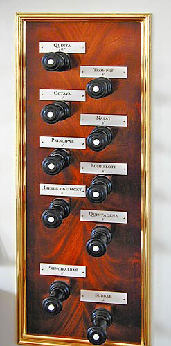 All of the manual pipework is placed on a single chest with the Werk at the front of the organ and the Hinterwerk behind. The scaling, construction of the pipework, and voicing are modeled after the small organs of Thuringia from the mid-18th century.